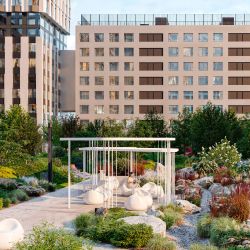 На территории комплекса реализована концепция "двор без машин". Центральное пространство оформлено как закрытый двор-сад с пешеходными аллеями, зонами отдыха, террасами и вечерней подсветкой. Здесь находятся детские и спортивные площадки, спортивные площадки, коворкинги на открытом воздухе и зоны отдыха. Также предусмотрены зоны для выгула собак с удобствами для гигиены питомцев.
