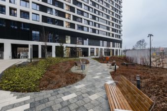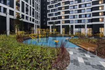 - дизайнерские дворы обустроены для резидентов любого возраста зонами отдыха, прогулок, детскими и спортивными площадками, все дорожки и скамейки подогреваются зимой;