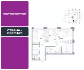3комнатная квартира площадью 70,8кв. м. на 26этаже в доме "Байкал" жилого комплекса "Страна.Озёрная" . Срок сдачи дома - 2 квартал 2026 года.