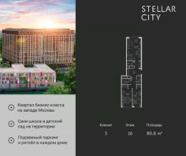 Stellar City — квартал в ЗАО Москвы вблизи инновационного центра Сколково. В окружении — 11 парков и природных зон, в том числе Долина реки Сетунь, Мещерский лес и парк развлечений The Rink.