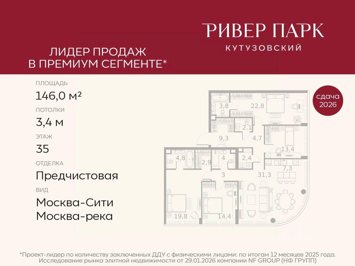 Продается 4-к квартира площадью 146.0 кв.м. на 35-м этаже в жилом комплексе премиум-класса Ривер Парк Кутузовский в Башне Изумруд