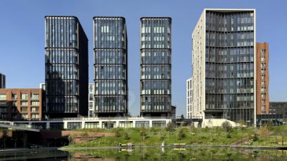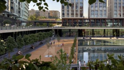 "Садовые кварталы" — городской ансамбль с собственным парком, бульварами и дворами без машин в Хамовниках. Архитектура держится на светлом камне, крупном остеклении и спокойных вертикалях; разные по высоте корпуса формируют чёткий городской рельеф. Входные группы напоминают лобби хорошей гостиницы: натуральные материалы, высокий потолок, стойки ресепшн и мягкие зоны. На территории работают клубные пространства и семейная инфраструктура, внутри квартала открыт World Class. Вечером дворики читаются камерно благодаря мягкой подсветке. Паркинг под корпусами связан с лобби лифтами.
