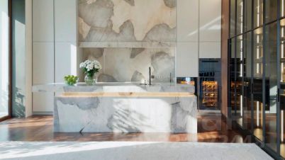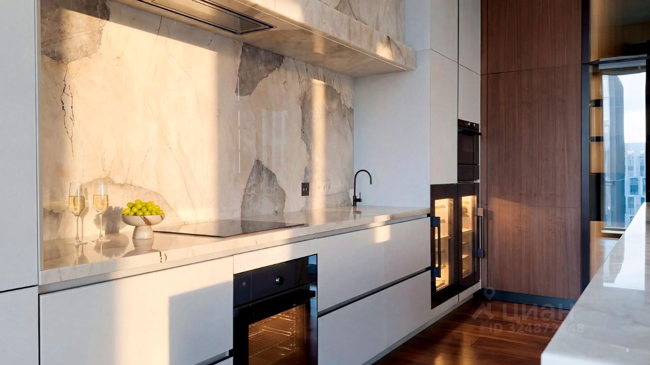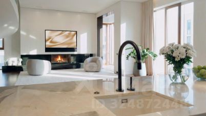 Пентхаус с дизайнерским ремонтом расположен на одиннадцатом этаже. В интерьерах использованы ценные породы дерева и натурального камня. В гостиной установлен дровяной камин. Благодаря панорамным и мансардным окнам пространство наполнено естественным светом.