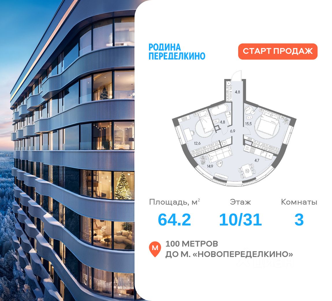 Продаётся 3-комнатная квартира площадью 64.2 м² на 10 этаже в Жилом Комплексе "Родина Переделкино".