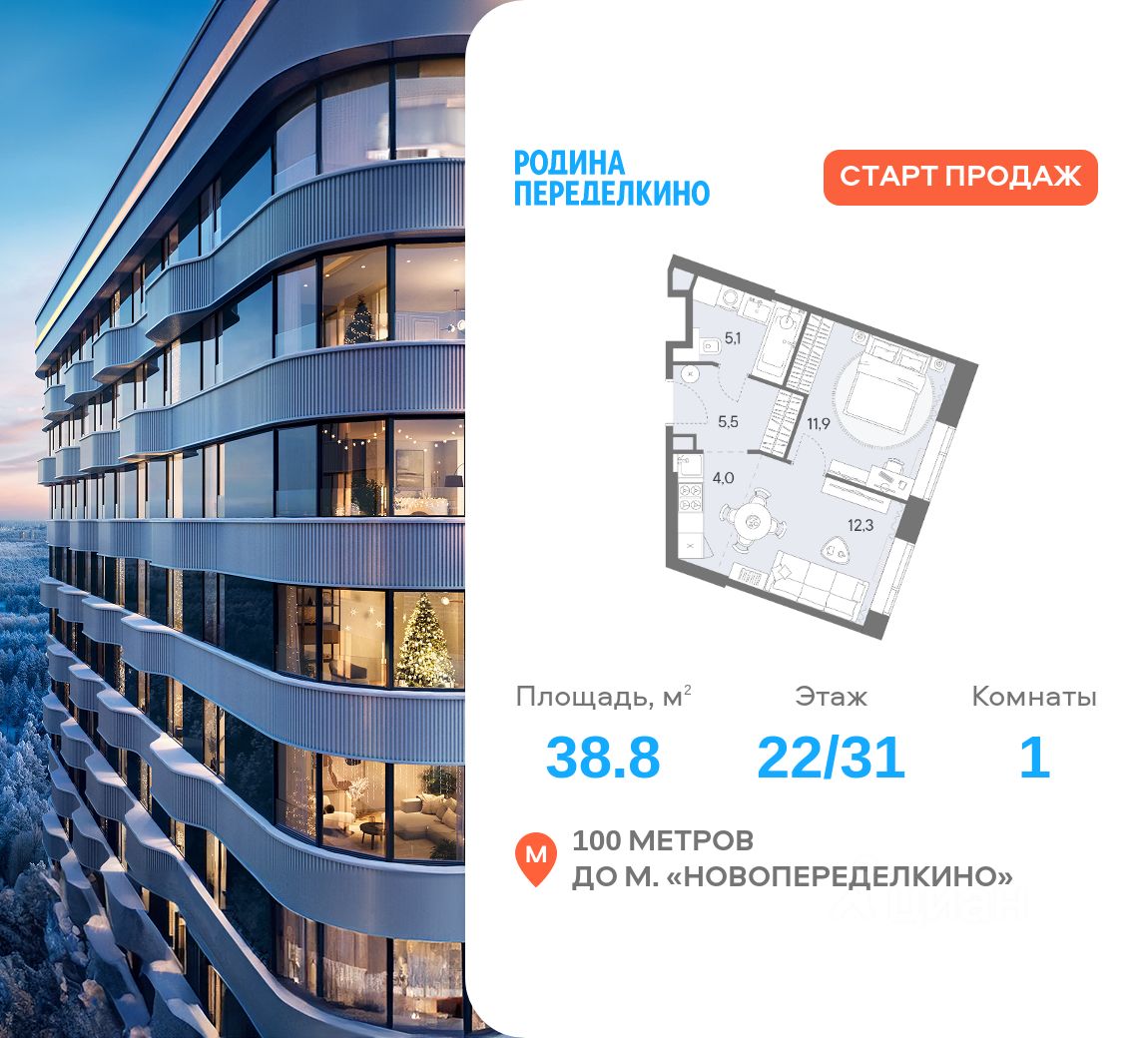 Продаётся 1-комнатная квартира площадью 38.8 м² на 22 этаже в Жилом Комплексе "Родина Переделкино".