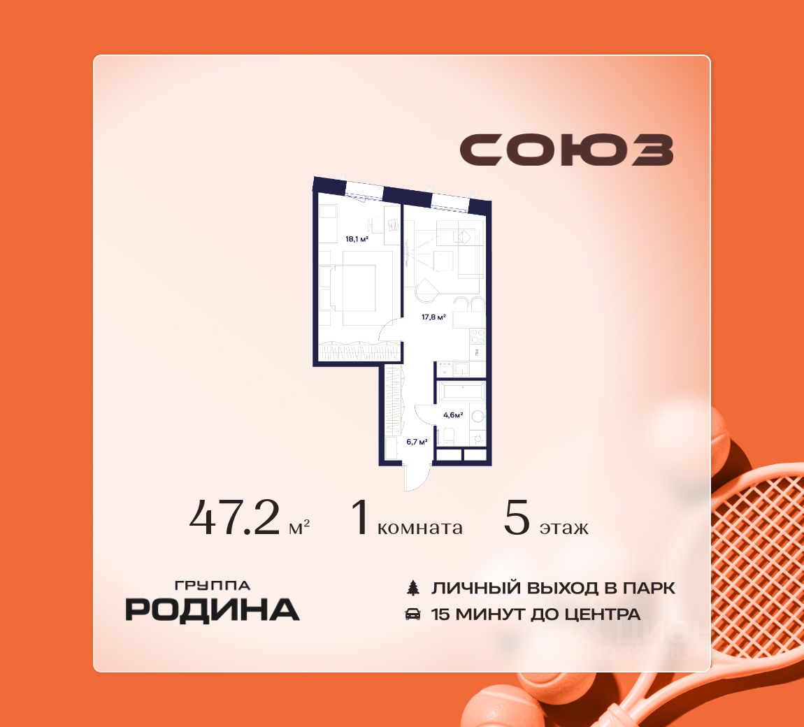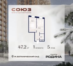 Продаётся 1-комнатная квартира площадью 47.2 м² на 5 этаже в Жилом Комплексе "Союз".