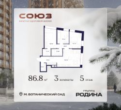 Продаётся 3-комнатная квартира площадью 86.8 м² на 5 этаже в Жилом Комплексе "Союз".