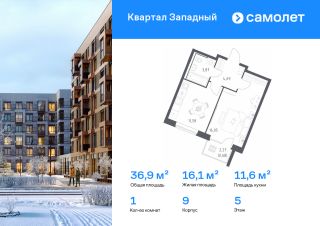 Строим кварталы для жизни с заботой о будущем. Предлагается 1-комнатная квартира комфорт-класса 36,87 кв.м в корпусе 9 на 5 этаже, в ЖК "Квартал Западный"