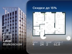Продается 2-комнатная квартира площадью 62.80 кв. м с отделкой. Квартира находится на 24 этаже 26-этажного корпуса 4, в новом жилом комплексе бизнес-класса Level Войковская, расположенном рядом с живописным заповедником "Покровское-Стрешнево" (застройщик - компания Level Group/Левел групп).