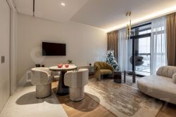 В квартире выполнена качественная отделка в современном элегантном стиле, планировочное решение позволило выделить отдельную кухню , вместительную систему хранения и прачечную. На балконе установлен биокамин, в санузле смонтирован хамам, мебель Ditreltalia, Bontempi, Cattelan Italia, ковры ручная работа, состав - шерсть, шелк (Индия ), установлена система канального кондиционирования, в квартире установлена система климат-контроля в части автоматического регулирования температуры батарей в отопительный сезон, смонтированы теплые полы в санузле, коридоре и кухне, полы - дубовый паркет (Россия), керамическая плитка (Италия), стены- краска (США), крупноформатный керамогранит ( Италия), шпон +эмаль, в шкафах предусмотрена подсветка, бытовая техника Haier, телевизор Samsung, розетки и выключатели VIMAR (Италия), смонтированы проходные выключатели, установлена система защиты от протечек НЕПТУН, установлена система очистки воды на кухне и измельчитель BONE CRASHER.