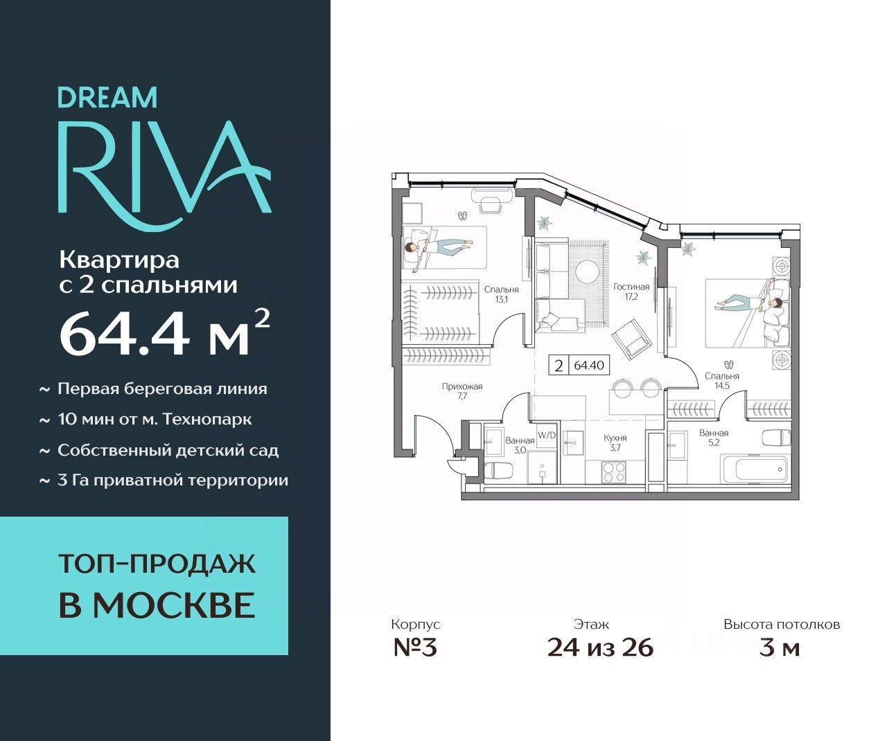 Продаётся Квартира с 2 спальнями квартира на 24 этаже 26-этажного дома (3 корпус).