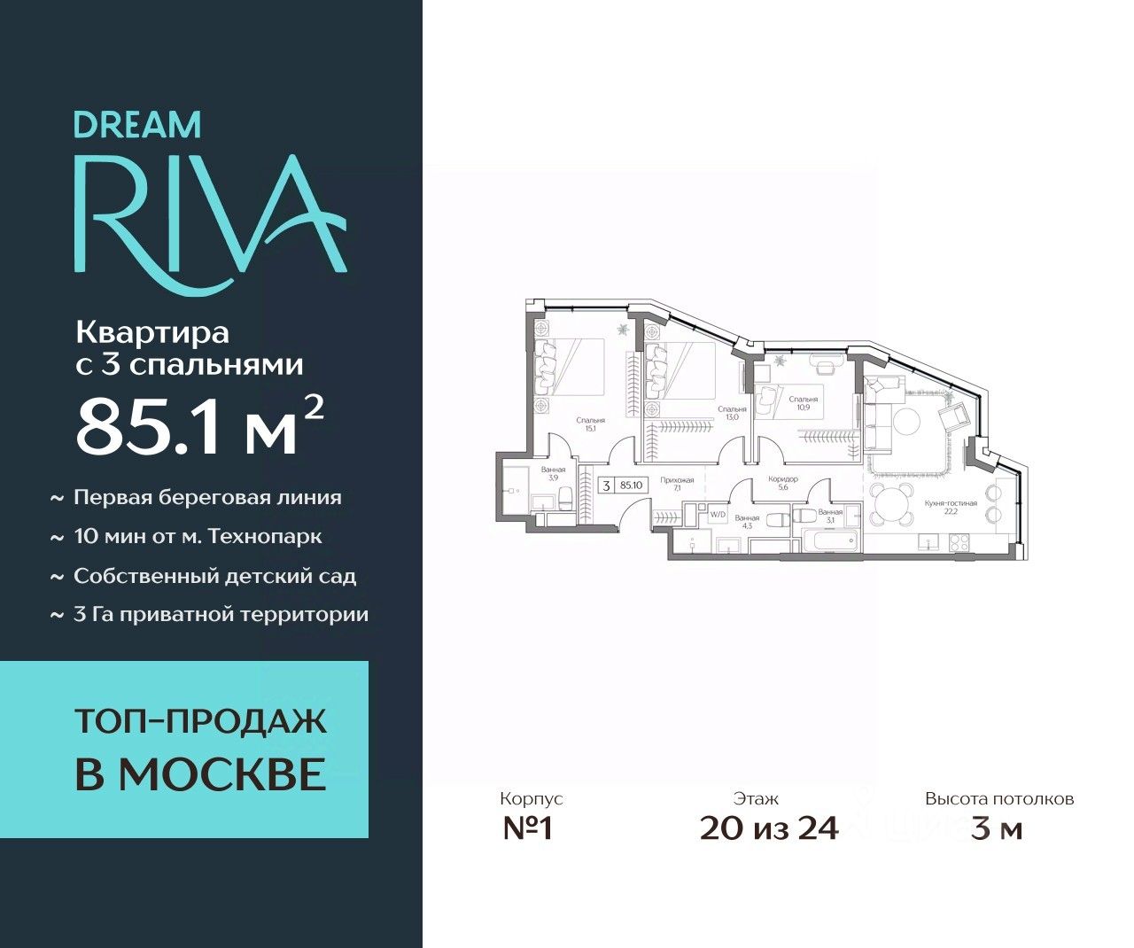 Продаётся Квартира с 3 спальнями квартира на 20 этаже 24-этажного дома (1 корпус).