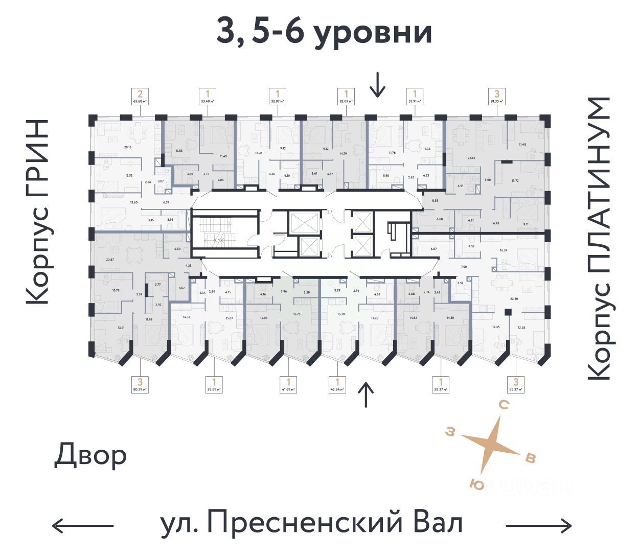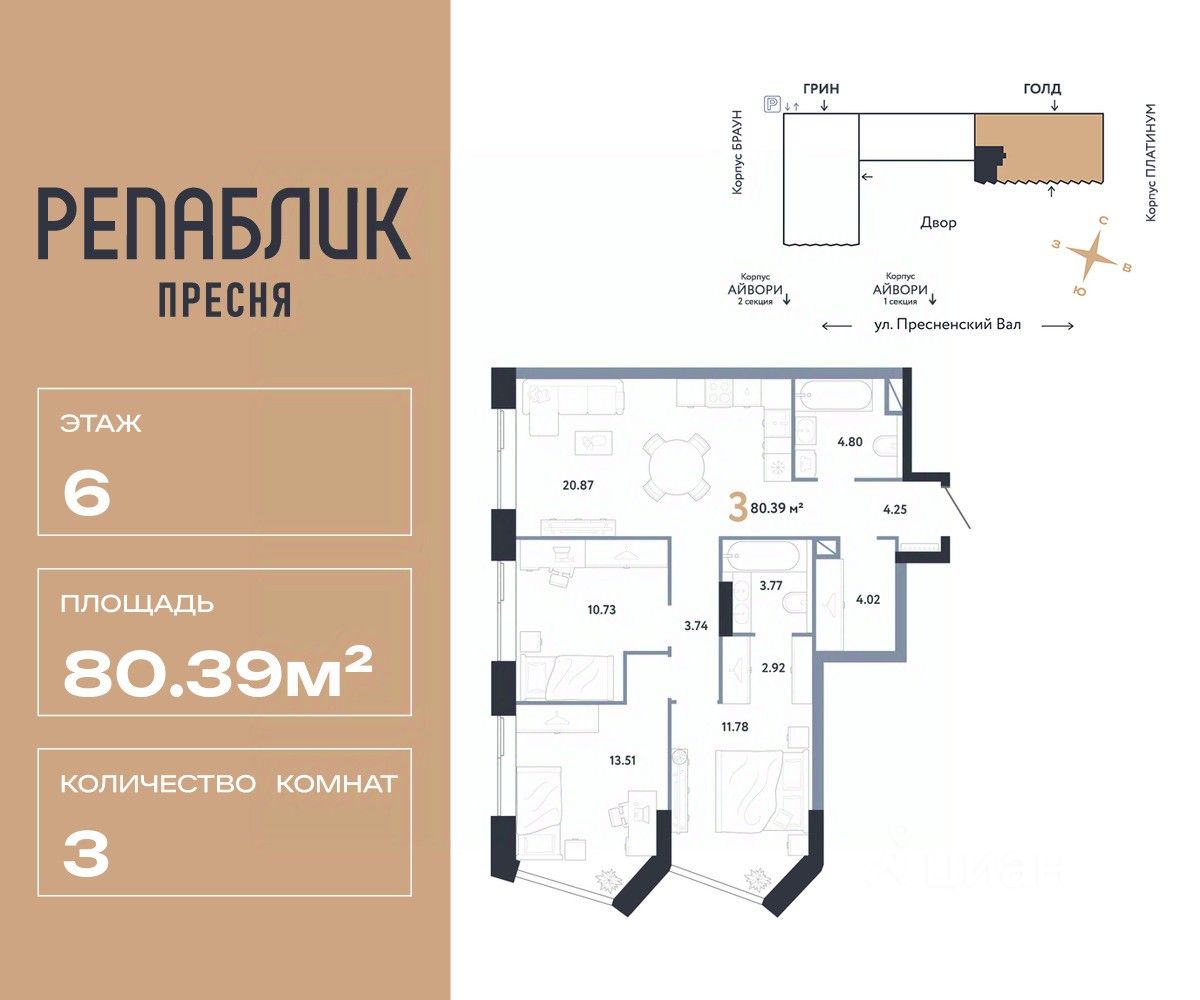 Продается 4комнатная квартира на 6 этаже от застройщика Страна Девелопмент. Площадь квартиры 80.39 кв. м.