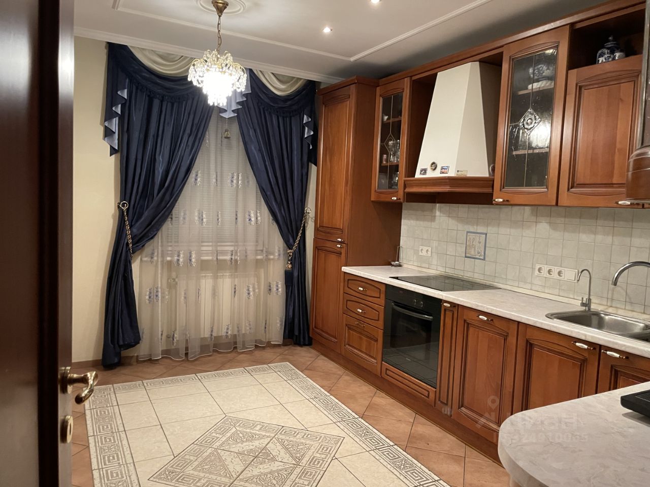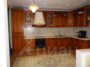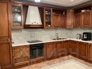Кухня площадью 14 м² оборудована деревянным итальянским гарнитуром из массива и встроенной техникой: холодильником, плитой, духовкой, посудомоечной машиной. Над рабочей поверхностью и обеденной зоной установлено дополнительное освещение для комфортного приготовления и приёма пищи.