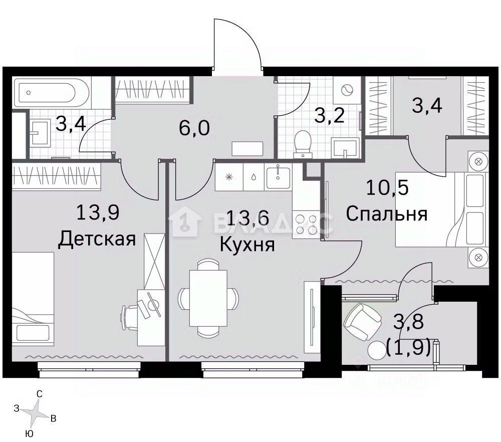 Общая площадь 55.9 м²: Кухня-гостиная 13.6 м², две изолированные спальни (13.9 м² и 10.5 м²).Отделка и планировка: Готовая отделка White Box, два совмещенных санузла, высота потолков — 3 метра.Свет и вид: Широкоформатные окна выходят во внутренний, благоустроенный двор комплекса. В квартире очень светло.Корпус: 1-й корпус, секция 4.