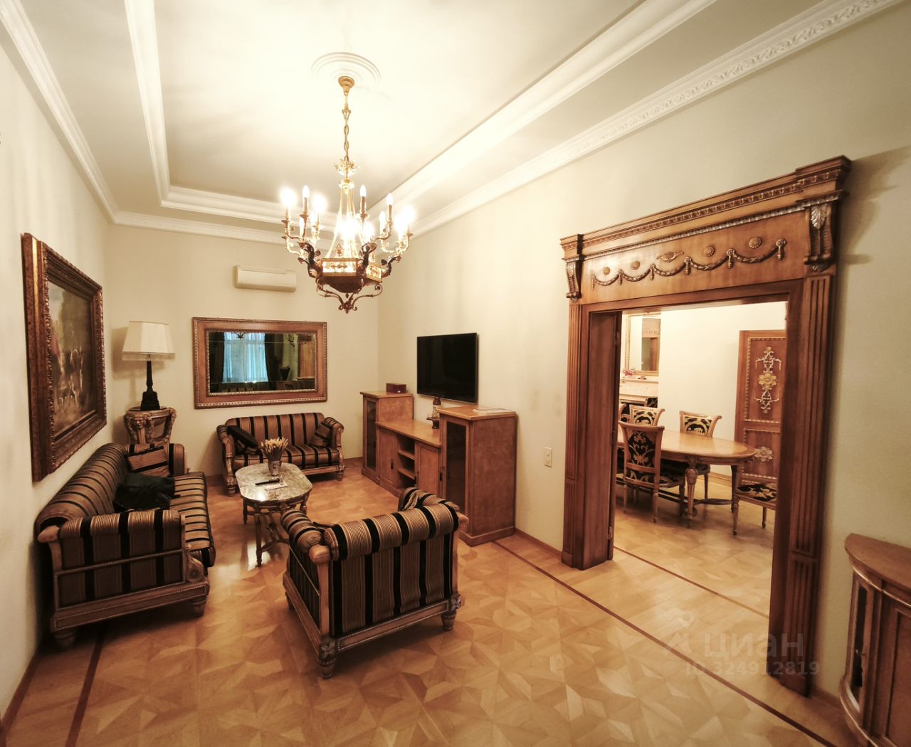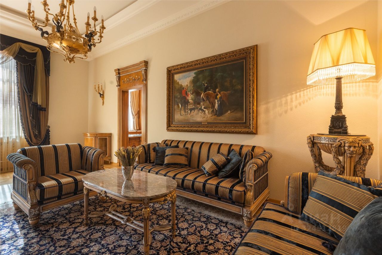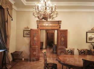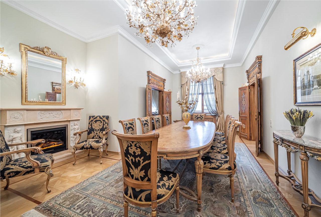 CREMA MARFIL, парадная столовая с камином LUIGI ANTICO итальянской фабрики BAROQUE STYLE, парадная люстра и бра SERGIO MECHINI изготовлена под заказ в Италии, паркетные полы индивидуального изготовления по раскладкам итальянской фабрики BERTI. Весь спальный гарнитур FRANCESCO MOLON выполнен из массива ценных пород дерева. Сантехфаянс и аксессуары производства Италии Devon&Devon.