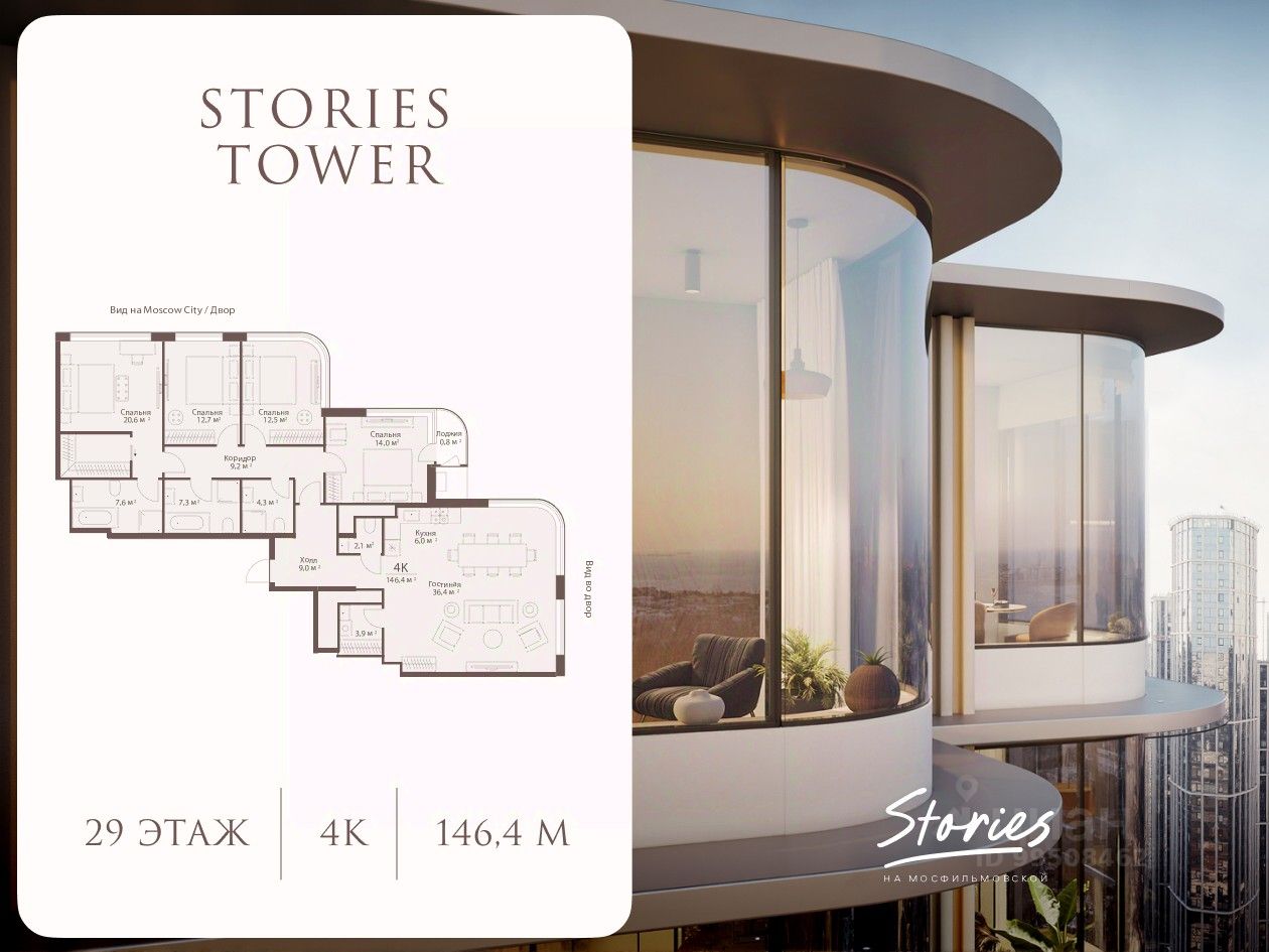 Пентхаус с панорамными видами в Сторис на Мосфильмовской! Просторный пентхаус с четырьмя спальнями на 146,4 м² на 29 этаже Сторис на Мосфильмовской. Пентхаус отличается элегантной и продуманной планировкой: спальные зоны и гардеробные гармонично объединены в уединенный мастер-блок, создавая атмосферу приватности и комфорта. Просторная кухня-гостиная площадью 42,2 м² станет идеальным местом для любых жизненных сценариев — будь то уютные семейные ужины, тёплые встречи с друзьями или вдохновляющие вечера в кругу близких. Высокие потолки 3,5 метров и моллированное панорамное остекление создают ощущение простора, наполняя интерьеры светом и воздухом. За панорамными окнами открываются вид на историческую Мосфильмовскую улицу. Для резидентов доступны: - Просторное лобби в стиле японского минимализма с зонами для работы и отдыха - Эксплуатируемая крыша с панорамными видами и зоной отдыха - Авторский двор-патио с ландшафтным дизайном и уединенными уголками - Закрытая территория без машин, современные системы безопасности и круглосуточное видеонаблюдение - Детский развивающий центр, коворкинг-зоны и инфраструктура на первом этаже, сервис бизнес-класса и статусное расположение в 2 минутах пешком от метро Аминьевская и 15 минутах от центра города — для тех, кто ценит и динамику, и камерность. Условия приобретения обсуждаются индивидуально с девелопером.