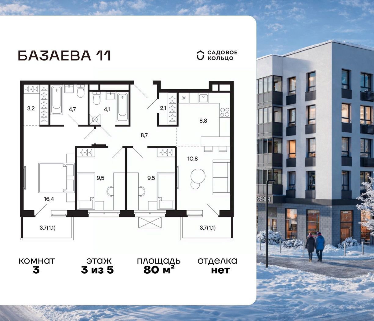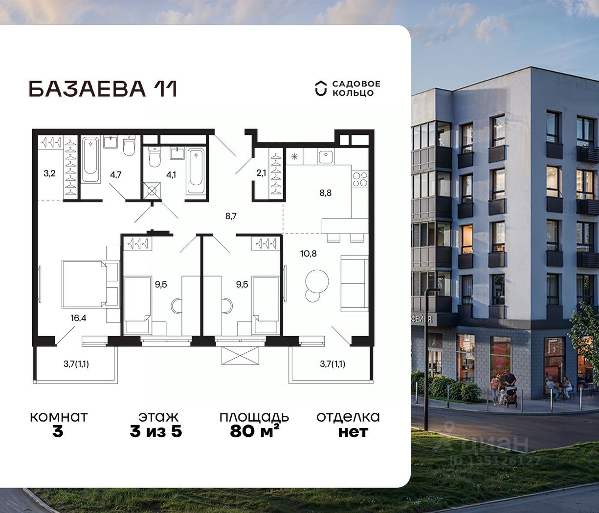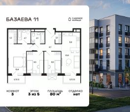 Продается квартира в ЖК "Базаева, 11" с 3 спальнями на 3 этаже 5 этажного дома. Общая площадь: 80 кв.м. Высота потолков 2.72 м. Срок сдачи 2 квартал 2027 г. Эскроу-счет. Застройщик ГК "Садовое кольцо".