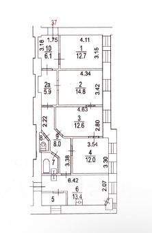 - Три изолированных комнаты: 12,7 кв.м, 14.8 кв.м и 12.6 кв. м