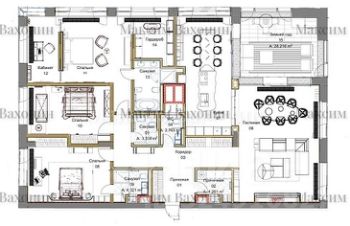 Планировка включает: кухня, гостиная-столовая, мастер спальня с зоной кабинета, гардеробной и санузлом, две спальни со своими санузлами, гардеробная , гостевой санузел, постирочная, зимний сад.
