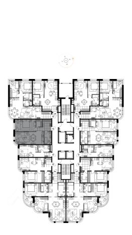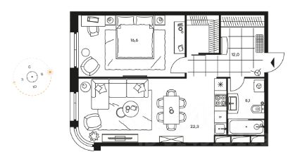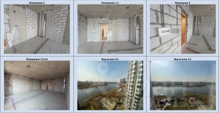 двухкомнатные апартаменты площадью 57,6 м² на 17-м этаже 25-этажной башни ЮГ с панорамным радиусным остеклением и прямым фронтальным видом на Москва-реку и Спасский затон.