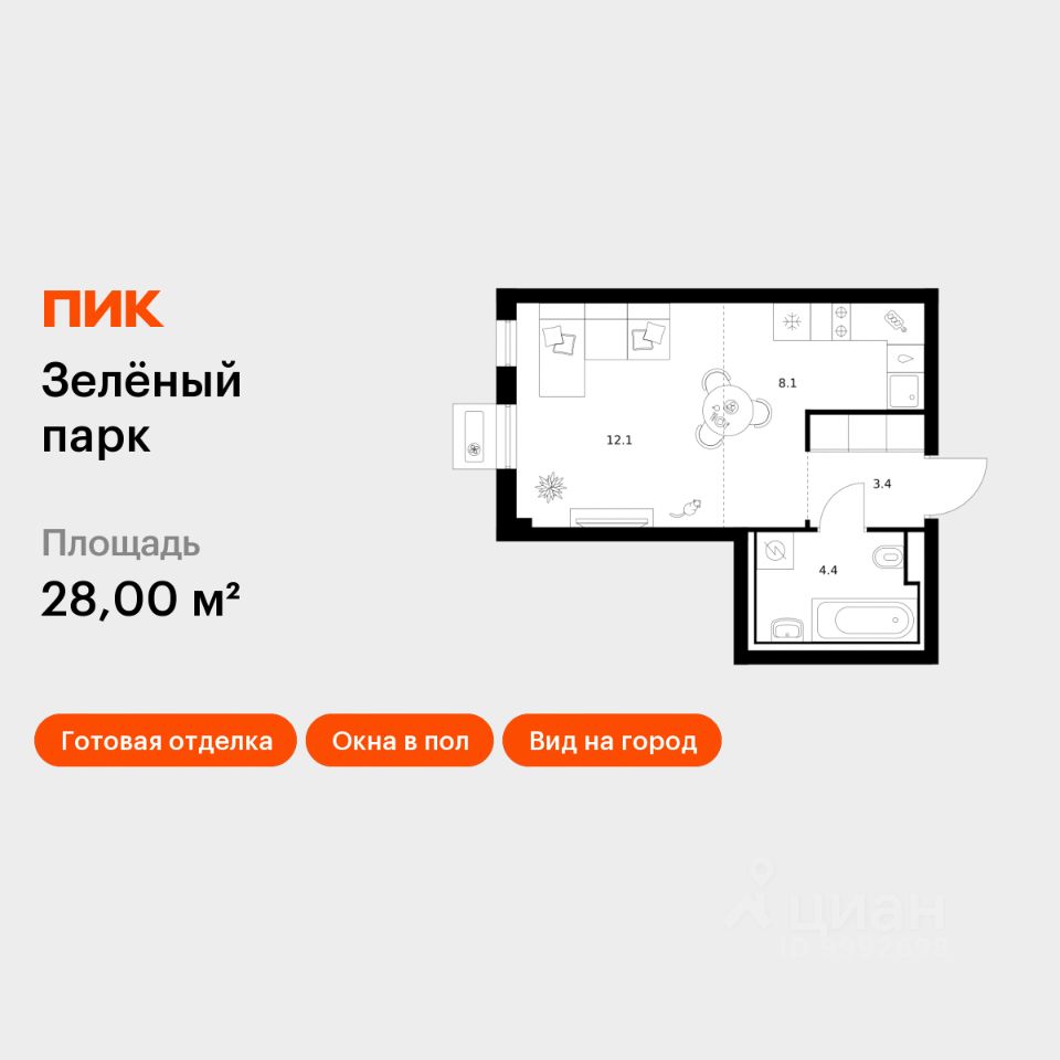 Продаётся квартира-студия площадью 28 кв.м на 6 этаже 13 этажного дома (Корпус 5.3, Секция 3) проекта ПИК Зелёный парк. Светлый просторный подъезд на уровне земли, функциональная планировка, большие окна, c отделкой.