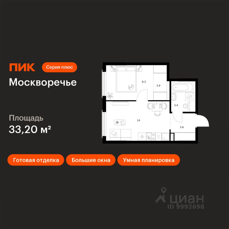 Продаётся 1-комн. квартира площадью 33,2 кв.м на 12 этаже 17 этажного дома (Корпус 1.2, Секция 2) проекта ПИК Москворечье. Светлый просторный подъезд на уровне земли, функциональная планировка, большие окна, c отделкой.