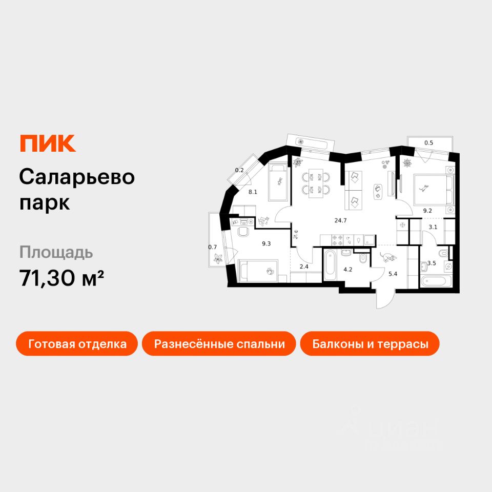 Продаётся 3-комн. квартира площадью 71,3 кв.м на 4 этаже 18 этажного дома (Корпус 74.6, Секция 6) проекта ПИК Саларьево парк. Светлый просторный подъезд на уровне земли, функциональная планировка, большие окна, c отделкой.