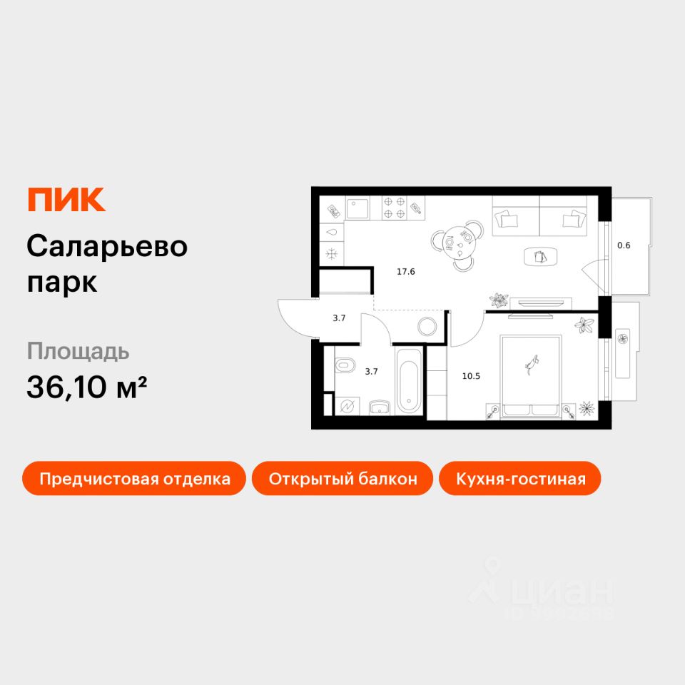 Продаётся 1-комн. квартира площадью 36,1 кв.м на 5 этаже 14 этажного дома (Корпус 57.5, Секция 5) проекта ПИК Саларьево парк. Светлый просторный подъезд на уровне земли, функциональная планировка, большие окна, предчистовая отделка.