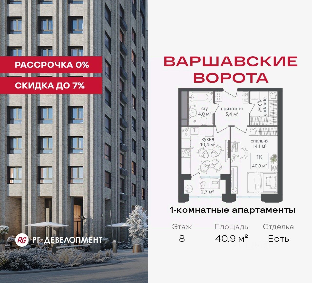 Продаются 1-комнатные апартаменты 40.9 кв.м. в МФК "Варшавские ворота" на 8-м этаже 30 этажного дома. МФК "Варшавские ворота" — это проект, в котором учтен широкий спектр требований: от транспортной доступности и развитой инфраструктуры до архитектурной выразительности и экологического окружения.