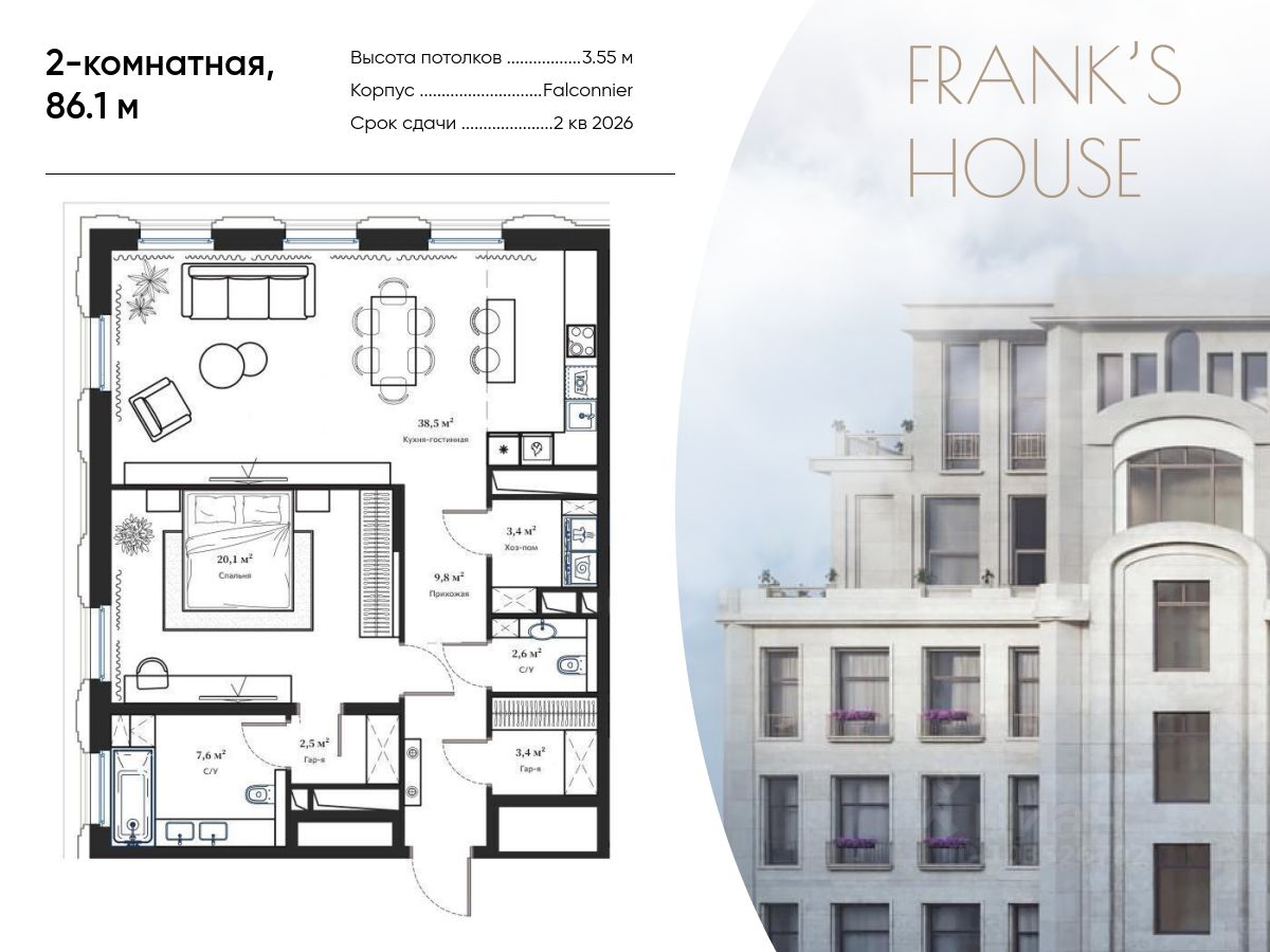 House Frank и абсолютное новое, современное трехсекционное здание House Falconnier. В центре архитектурной композиции проекта - приватный зеленый внутренний двор с ландшафтным дизайном. Всего в комплексе запланировано 147 премиальных резиденций, площадью от 63 до 263 кв. метров с возможностью объединения. На первых этажах расположены квартиры с частными палисадниками, обрамленными живой изгородью, верхние же этажи занимают просторные пентхаусы с простыми углубленными террасами и панорамным остеклением, дающие возможность любоваться историческими и культурными памятниками Москвы, не выходя из дома. Подземный паркинг жилого комплекса располагает достаточным количеством мест для удобного размещения ваших транспортных средств.