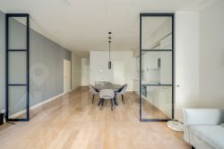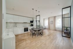 Общая площадь 118,6 кв.м, на 3 этаже с окнами во двор. Планировочное решение: кухня-гостиная, 3 изолированные комнаты, 2 с/у совмещенные (ванная и душевая комнаты), 1 с/у гостевой, гардеробная комната, постирочная. Высота потолков 3 м.