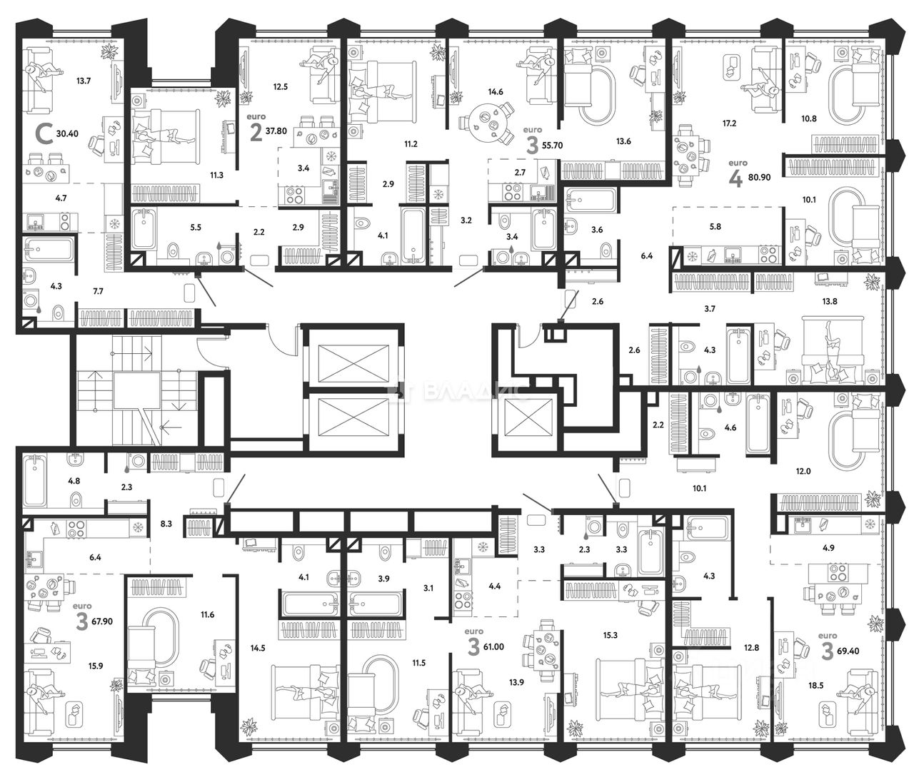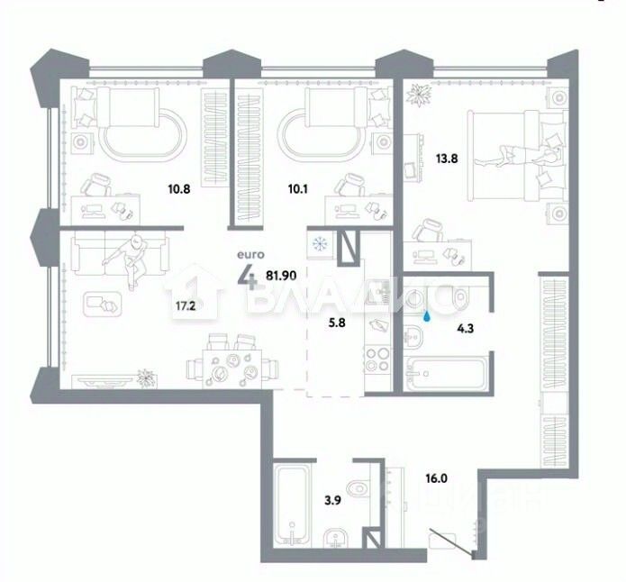 В квартире две совмещённые ванные комнаты, комнаты изолированные, окна выходят на улицу. Квартира угловая, что обеспечивает хорошую освещённость. Высота потолков — 3 метра.