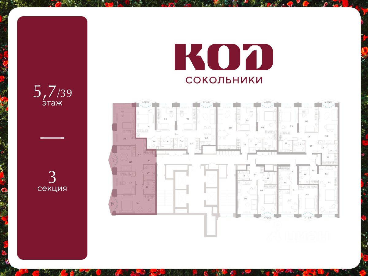 В семейном жилом квартале, расположенном в окружении более 500 га леса и объектов исторического наследия, продается 3-комнатная квартира площадью 88.5 кв. м без отделки. Квартира расположена на 5 этаже 39-этажного корпуса 2.1 жилого квартала бизнес-класса КОД Сокольники от девелопера Новая Эра.