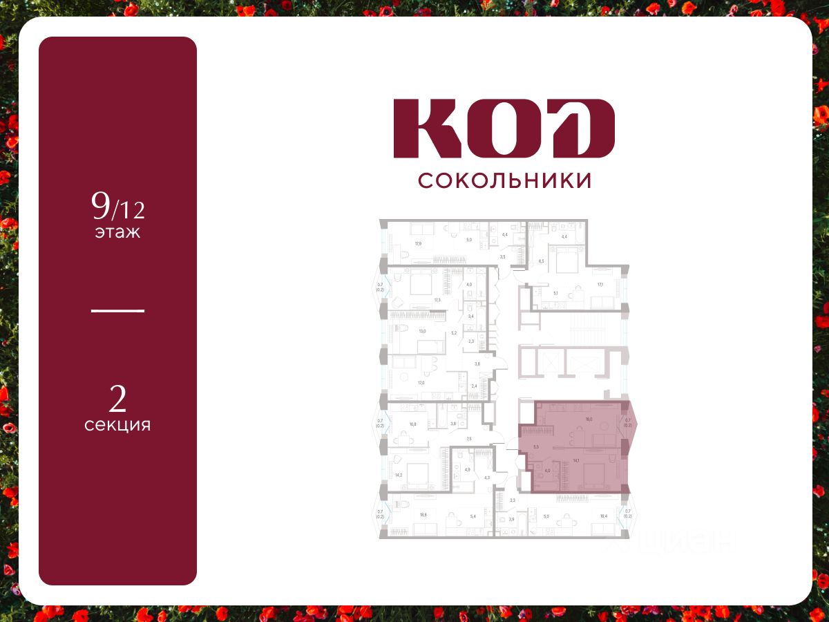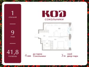 В семейном жилом квартале, расположенном в окружении более 500 га леса и объектов исторического наследия, продается 1-комнатная квартира площадью 41.8 кв. м без отделки. Квартира расположена на 9 этаже 12-этажного корпуса 2.1 жилого квартала бизнес-класса КОД Сокольники от девелопера Новая Эра.