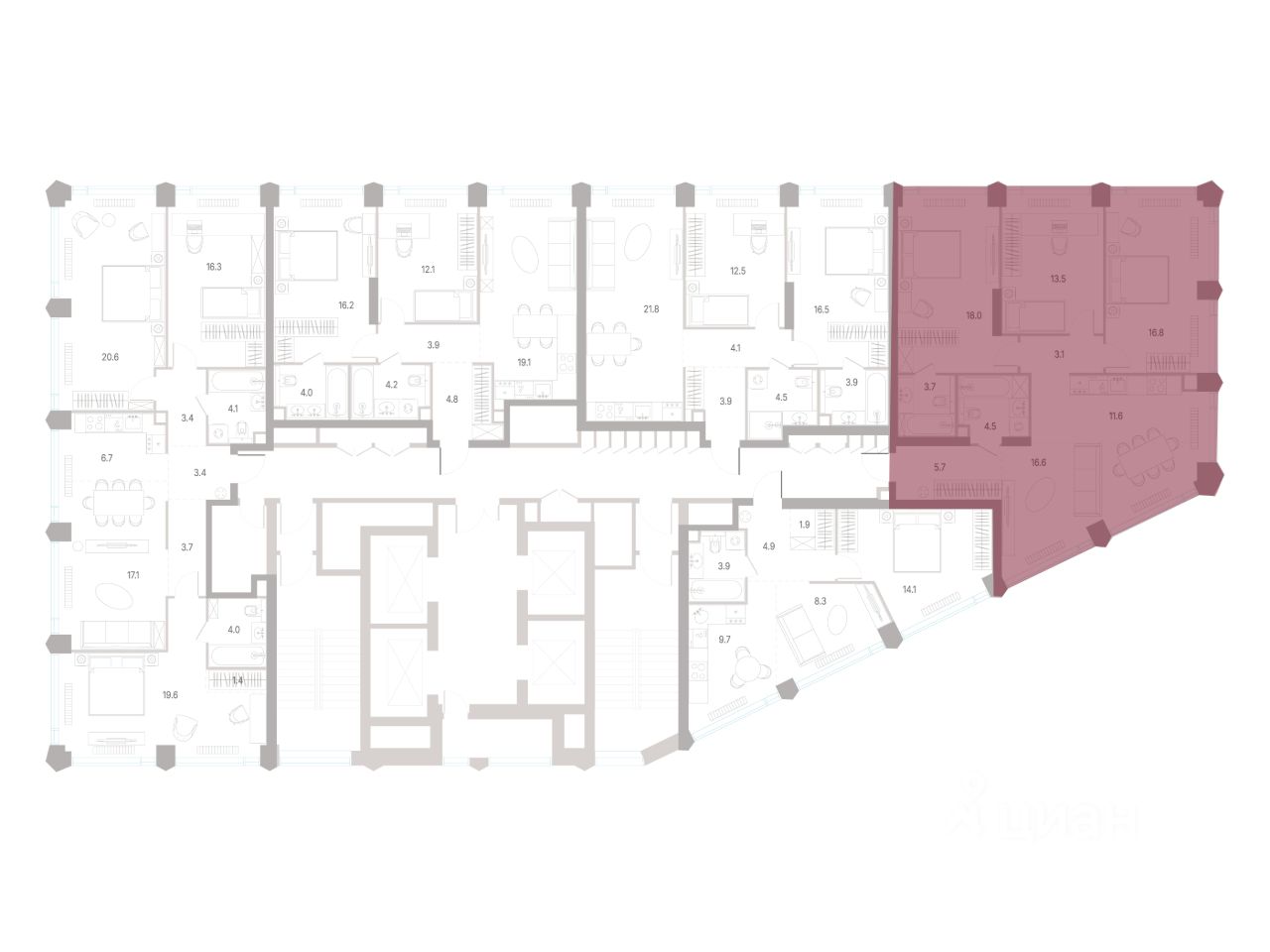 - 30% квартир - угловые. Увеличенные оконные проемы, панорамное остекление и продуманное расположение комнат усиливают эффект обзорности: гостиные и спальни получают максимум дневного света и живописные виды, которые становятся частью интерьера;