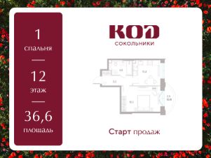 В семейном жилом квартале, расположенном в окружении более 500 га леса и объектов исторического наследия, продается 1-комнатная квартира площадью 36.6 кв. м без отделки. Квартира расположена на 12 этаже 39-этажного корпуса 2.2 жилого квартала бизнес-класса КОД Сокольники от девелопера Новая Эра.