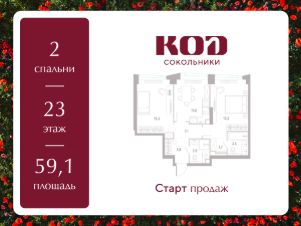 В семейном жилом квартале, расположенном в окружении более 500 га леса и объектов исторического наследия, продается 2-комнатная квартира площадью 59.1 кв. м без отделки. Квартира расположена на 23 этаже 39-этажного корпуса 2.2 жилого квартала бизнес-класса КОД Сокольники от девелопера Новая Эра.
