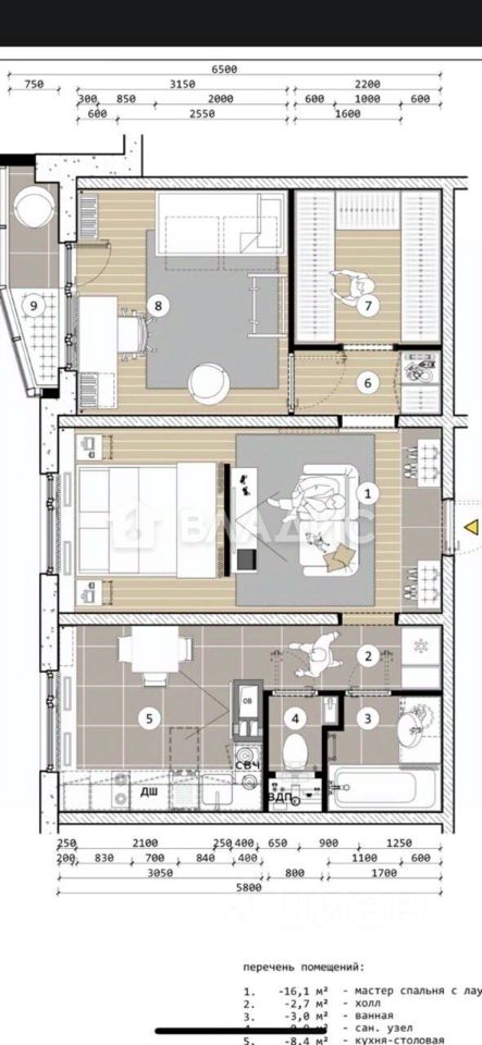 Квартира продается с мебелью, которая является частью дизайн-проекта.