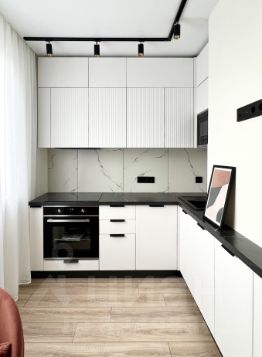 - Кухонный гарнитур всем укомплектован: посудомойка, духовой шкаф, варочная панель, встроенная микроволновка, вытяжка, встроенный холодильник, подсветка, фильтры воды.