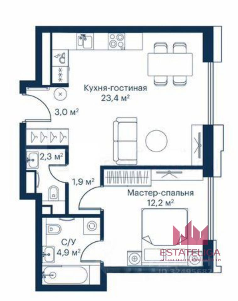 Планировка квартиры - кухня + гостиная, гостевой санузел, + мастер спальня с санузлом, есть возможность оборудовать гардеробную!