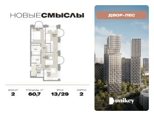 В жилом комплексе, расположенном по соседству с ландшафтным парком "Южное Бутово", продается 2-комнатная квартира площадью 60.70 кв. м. с отделкой. Квартира расположена на 13 этаже 2 корпуса в жилом квартале комфорт-класса "Новые Смыслы" (ГК Unikey/Юникей).