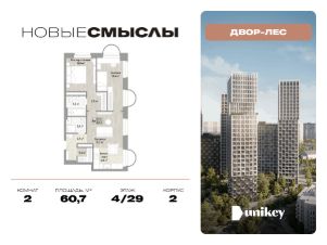 В жилом комплексе, расположенном по соседству с ландшафтным парком "Южное Бутово", продается 2-комнатная квартира площадью 60.70 кв. м. с отделкой. Квартира расположена на 4 этаже 2 корпуса в жилом квартале комфорт-класса "Новые Смыслы" (ГК Unikey/Юникей).