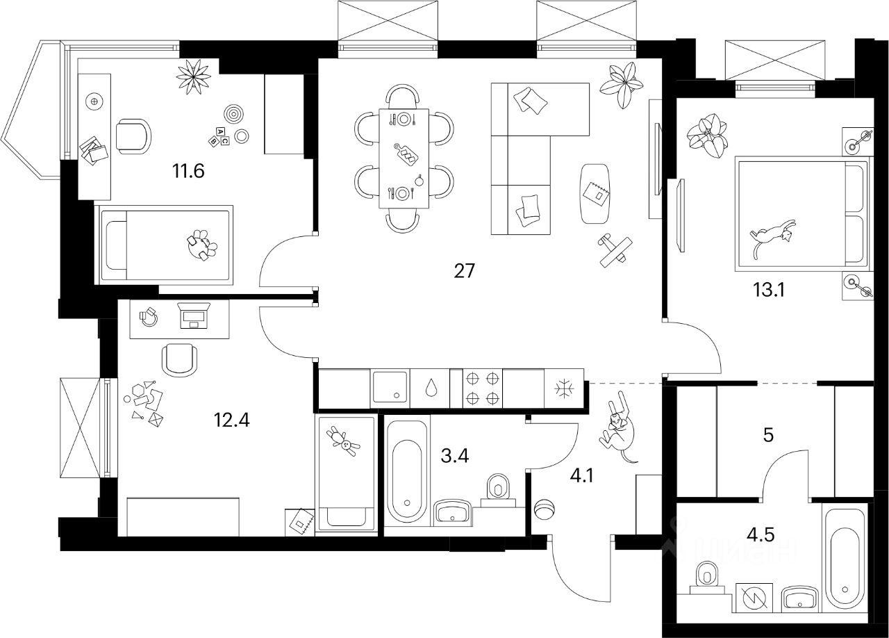 В корпусах 4.4 и 4.5 открытые балконы разнообразных форм: прямоугольные, фигурные. Все балконы выходят в тихий внутренний двор-парк. В эркерной части обоих корпусов предусмотрены лоджии.