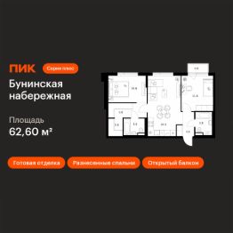 Продаётся 2-комн. квартира площадью 62,6 кв.м на 16 этаже 16 этажного дома (Корпус 2.6/1.3, Секция 3) проекта ПИК Бунинская набережная. Светлый просторный подъезд на уровне земли, функциональная планировка, большие окна, c отделкой.