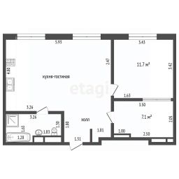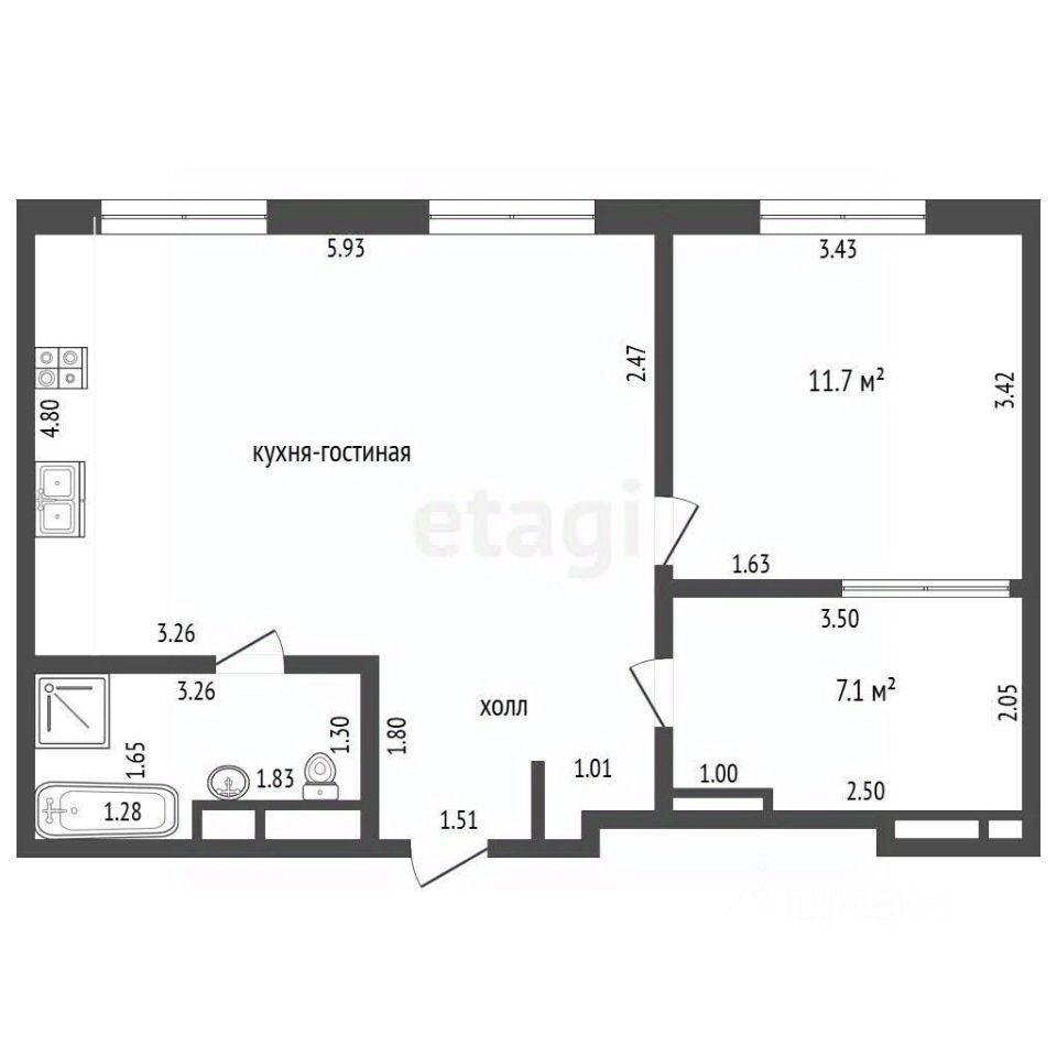 Просторная кухня 15 м² и жилая площадь 28 м² (общая — 56 м²).