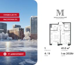 Продаётся 1-к квартира 41,0 кв.м. в ЖК "Михалковский" на 4-м этаже 9 этажного дома.