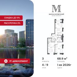 Продаётся 3-к квартира 68,9 кв.м. в ЖК "Михалковский" на 4-м этаже 9 этажного дома.