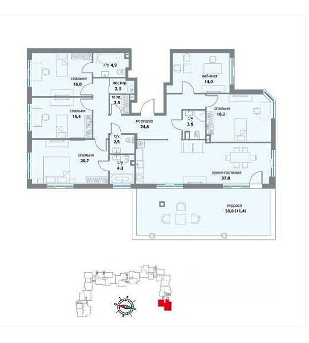 Один из вариантов планировки: Спальня_1 16 м², Спальня_2 15,4 м², Спальня_3 20,7 м², Спальня_4 16,2 м², Кабинет 14 м², Кухня-гостиная 37,8 м². 4 с/у, гардеробные.