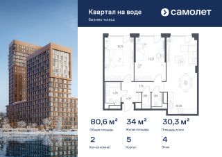 Строим кварталы для жизни с заботой о будущем. Предлагается 2-комнатная квартира бизнес-класса 80,59 кв.м в корпусе 5 на 4 этаже, в ЖК "Квартал на воде"